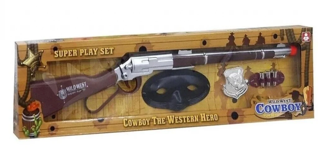 Rozet, mermi, maske, içeriği olan Oyuncak Kovboy Tüfek Set