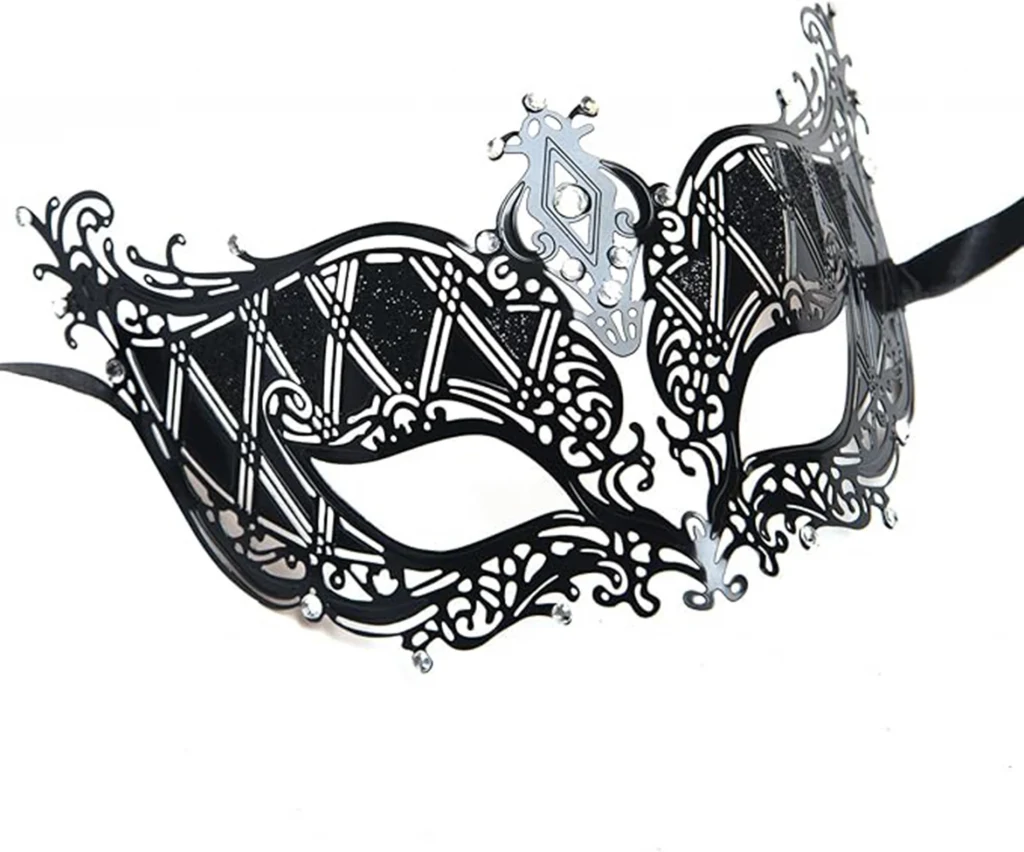Siyahın zarifliği, gümüşün ışıltısı ve kristallerin büyüsüyle bir araya gelen bu metal maske, balo ve özel gecelerinizde göz kamaştıracaksınız. Lüks ve sofistike tasarımıyla öne çıkan bu maske, gizemli ve çekici bir görünüm yaratmanıza yardımcı olacak.